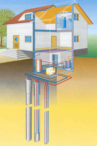 Der Untergrund hat in 100 m Tiefe eine Temperatur von 10 bis 12 °C. Diese Wärme gewinnt man durch eine Erdsonde, die aus einem U-förmigen Rohrsystem besteht. Kaltes Wasser strömt in die Tiefe und nimmt Wärme vom Erdreich auf. Eine Wärmepumpe im Haus kühlt es wieder - wie in einem Kühlschrank - auf die ursprüngliche Temperatur ab. Die anfallende „Abwärme“ wird bei einer Temperatur von 35 bis 45 °C in der Fußbodenheizung und bei der Brauchwassererwärmung genutzt. Drei Viertel der Energie entnehmen Sie kostenlos der Erde, ein Viertel benötigen Sie als Betriebsstrom.